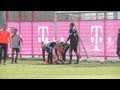 Sowohl in Pflichtspielen, als auch im Training, die Bayern haben Spaß auf dem Platz und das zeigen sie auch. Als Rafinha am Boden liegt, greift Ribery dem Brasilianer zwischen die Beine.